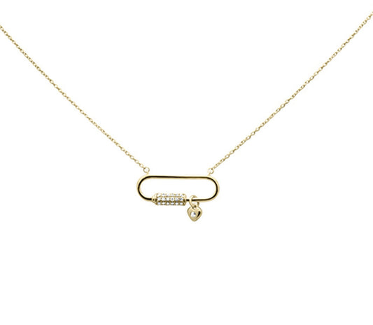 14K Gold Diamond Paper Clip Pendant Necklace With Dangling Heart